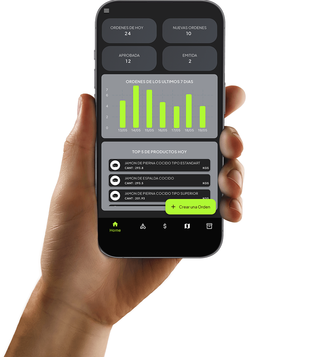 Registra pedidos desde el celular.Visualízalos al instante en tu panel.Analiza el rendimiento de tu equipo.Todo, en una sola plataforma inteligente.